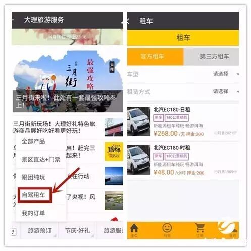 ?關(guān)注微信公眾號“大理旅游服務(wù)”,點擊菜單進(jìn)入“自駕租車”;