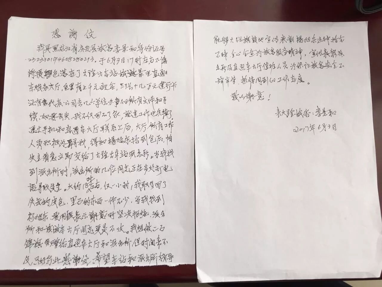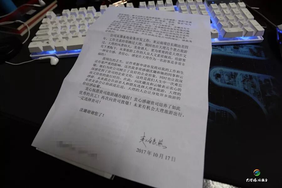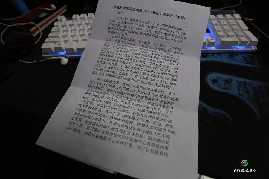 信中說到,10月15日中午11點左右,大理任你游旅行社有限公司機場巴士乘務(wù)員沈璐像往常一樣,在車上給游客介紹大理的風土人情。大巴車行駛到觀音塘左右,沈璐突然接到一個電話,聽對方的語氣似乎很著急,原來是之前在市區(qū)下車的一位游客,因為有事趕著去怒江,在乘坐機場巴士的時候,把錢包放遺落在了座位上,在超市購物的時候才知道錢包丟失了,錢包里有重要的信息和所有的證件,現(xiàn)在很著急!